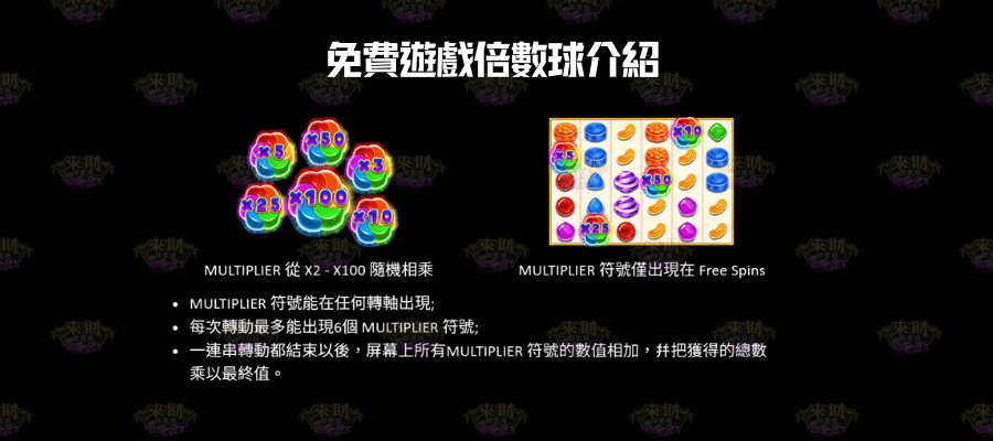 《轟炸糖果》真正的亮點,其實是在免費遊戲。一旦進入這個階段,盤面會開始掉出 倍數球,而且只有免費遊戲才會看到。倍數範圍從 x2 到 x100,出現得越多,累積起來的效果就越明顯。